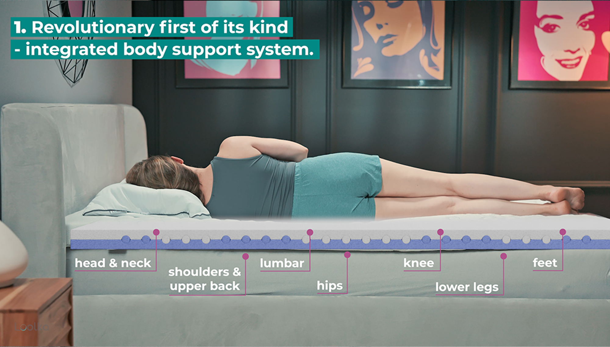 Einzigartig gestaltet, um sich der natürlichen Form Ihres Körpers anzupassen und gezielte Unterstützung für Kopf, Nacken, Schultern, oberen Rücken, Lendenbereich, Hüften, Knie, Unterschenkel und Füße zu bieten.